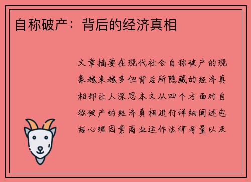 在现代社会,自称破产的现象越来越多,但背后所隐藏的经济真相却让人深思。本文从四个方面对自称破产的经济真相进行详细阐述,包括心理因素、商业运作、法律考量以及社会影响,深入挖掘了这一现象的根源和影响。通过对这些方面的分析,希望能够更全面地理解自称破产现象,从而为社会经济健康发展提供一些思考和启示。